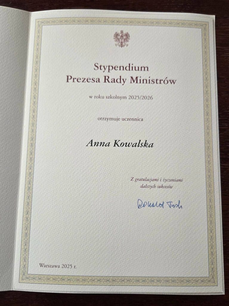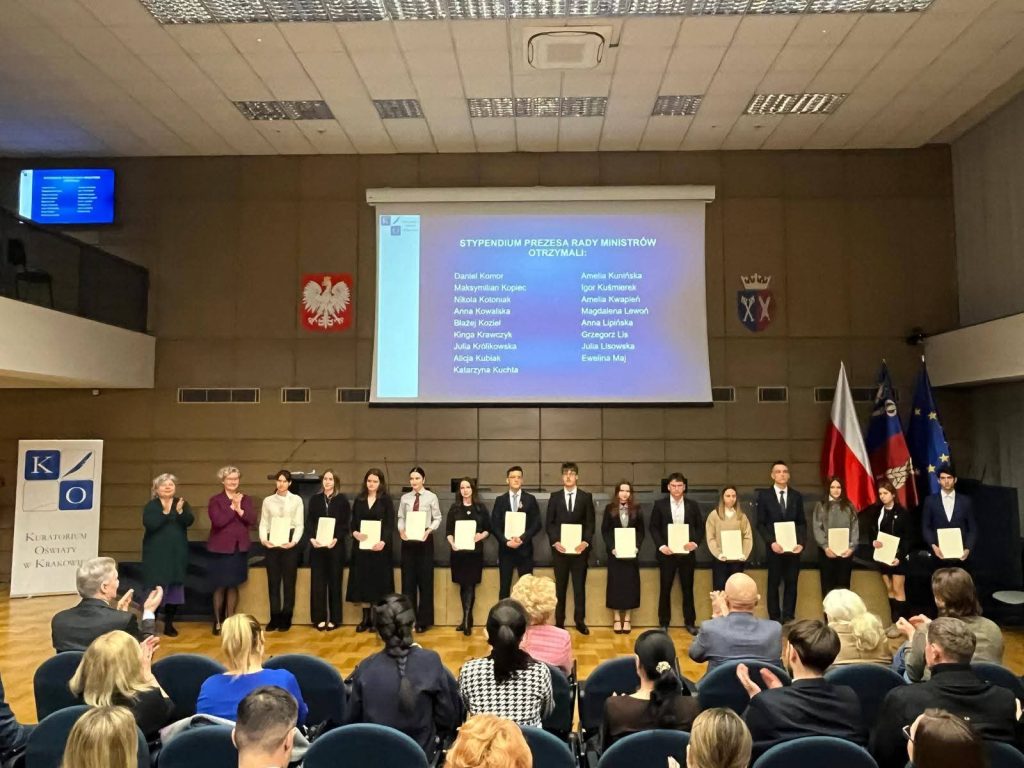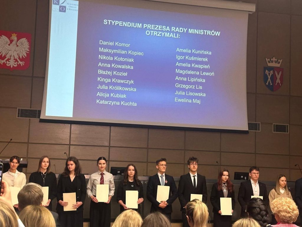 Z dumą informujemy, że uczennica klasy IVa Ania Kowalska odebrała dyplom oraz stypendium Prezesa Rady Ministrów, przyznawane za najwyższą średnią ocen w szkole oraz uzyskanie promocji z wyróżnieniem. Uroczysta gala wręczenia nagród odbyła się w obecności Małopolskiej Kurator Oświaty, która osobiście przekazała wyróżnienia najlepszym uczniom z regionu.