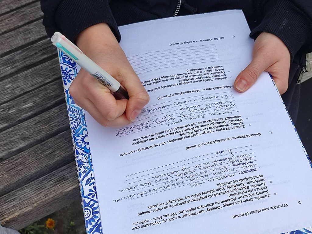 Aby połączyć obserwacje z nauką, uczniowie uzupełniali specjalnie przygotowane karty pracy, opracowane przez nauczycielkę fizyki – Panią Paulinę Seremak- Peczkis. Zadania dotyczyły m.in. zjawisk atmosferycznych, ruchu ciał niebieskich oraz ciekawostek astronomicznych. Praca w terenie okazała się świetnym sposobem na naukę poprzez doświadczenie.