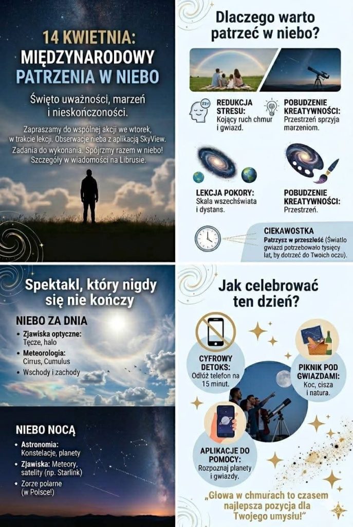 14 kwietnia obchodziliśmy Międzynarodowy Dzień Patrzenia w Niebo – idealny moment, by na chwilę zwolnić, oderwać wzrok od codzienności i… spojrzeć w górę. Czasem wystarczy kilka sekund, by dostrzec coś wyjątkowego: niezwykły układ chmur, zmieniające się światło czy kolory nieba, które łatwo przeoczyć w pośpiechu.