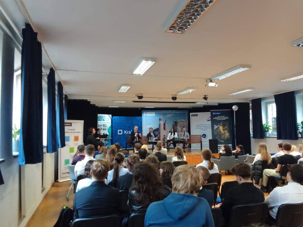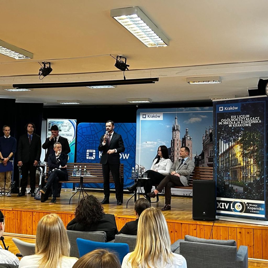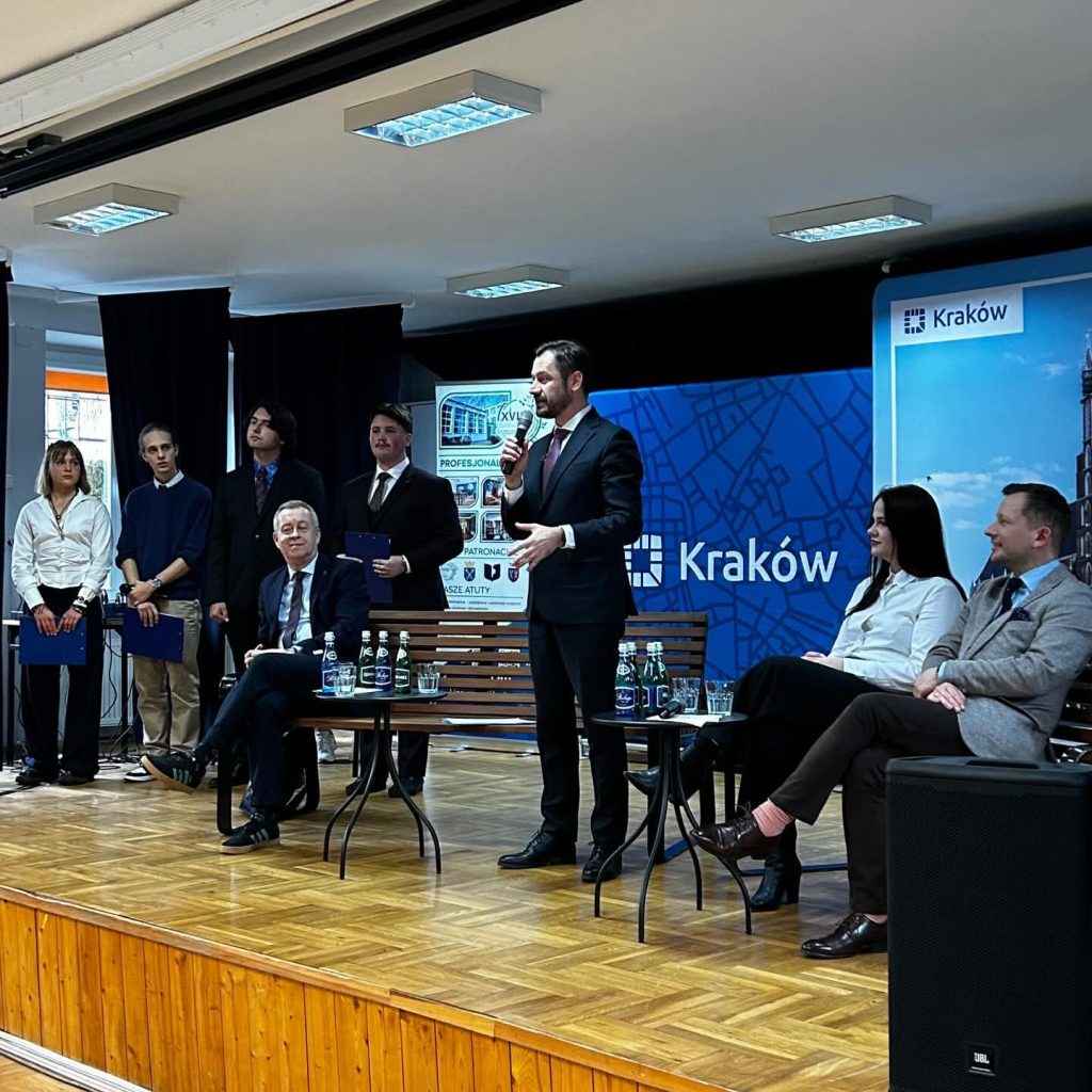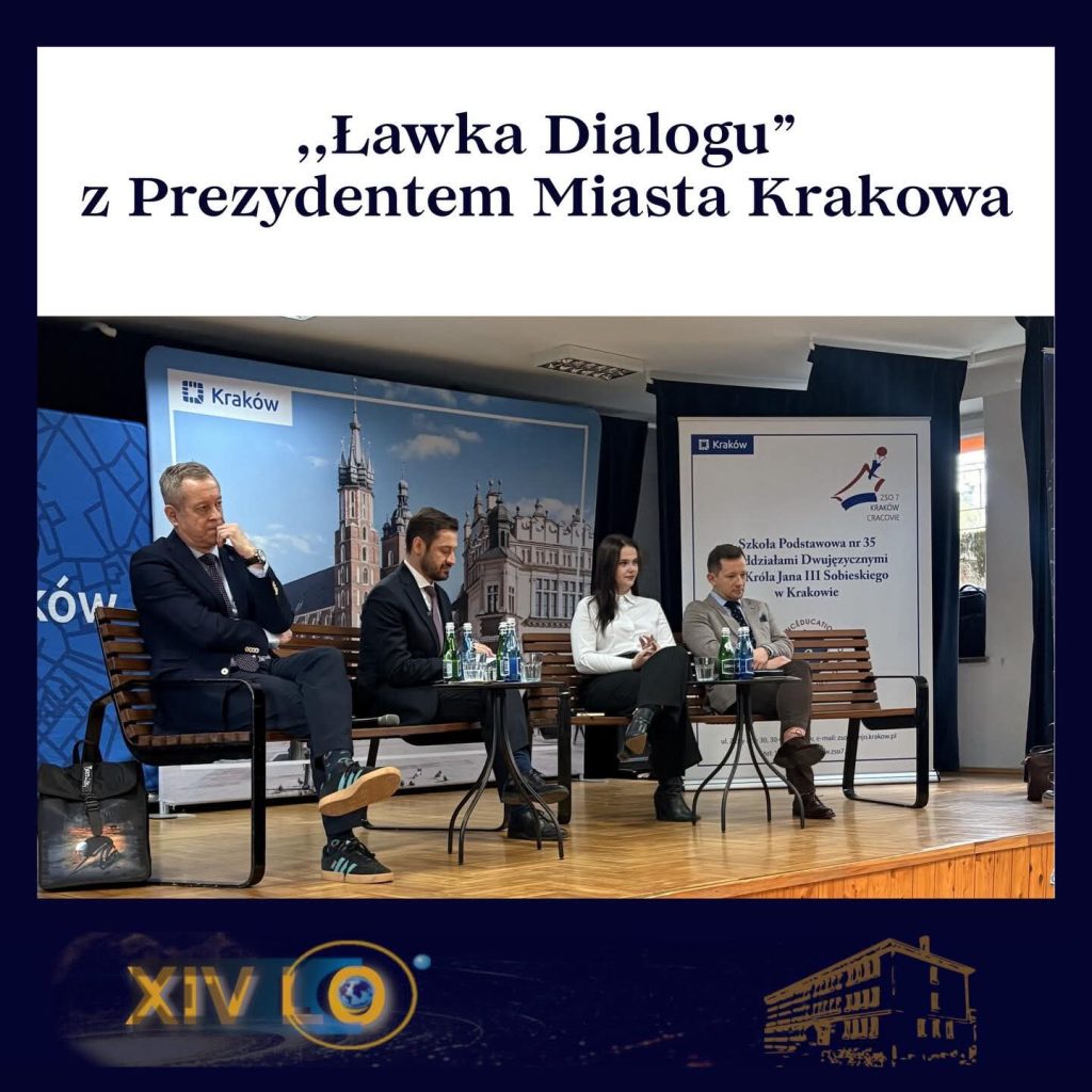 16 kwietnia reprezentacja naszej szkoły brała udział w spotkaniu z prezydentem Krakowa- Aleksandrem Miszalskim. Spotkanie to odbyło się w ramach inicjatywy Szkolna Ławka Dialogu. Nasi maturzyści mieli szansę zadać pytania dotyczące wielu ważnych aspektów życia w mieście, takich jak ekologia, mieszkalnictwo, szkolnictwo, rynek pracy, czy AI. Prezydent Miszalski nie uciekał od najtrudniejszych nawet tematów. Takie spotkania są niezwykle potrzebne, angażują młodych ludzi w sprawy związane z naszym miastem, uczą dyskusji i zwracają uwagę włodarzy Krakowa na naprawdę ważne dla młodych sprawy.